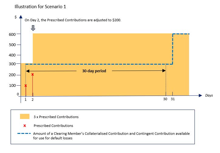 2.2 In accordance with Rule 7.10.5, the aggregate amount of the Clearing Member’s Collateralised Contribution and Contingent Contribution that can be applied in respect of all Events of Default occurring within Day 1 to Day 30 shall not exceed an amount equal to three times of that Clearing Member's Prescribed Contributions on Day 1. Therefore, even though the Clearing Member’s Prescribed Contributions were increased to $200 on Day 2, the aggregate amount of the Clearing Member’s Collateralised Contribution and Contingent Contribution which can be applied to meet default losses occurring within Day 1 to Day 30 will not exceed $300 (i.e. 3 x $100).