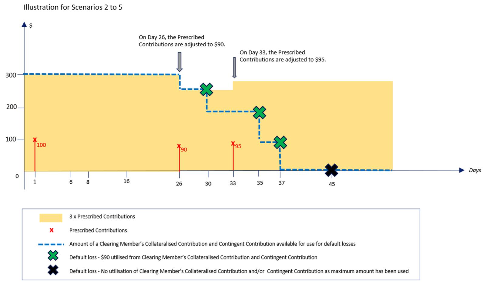 3.11 Scenario 5: Continuing from Scenario 4, $90 of the Clearing Member’s Collateralised Contribution and Contingent Contribution was used to meet losses suffered by the Clearing House arising from the third default on Day 37. A fourth default occurred on Day 45. This scenario illustrates the amount of the non-defaulting Clearing Member’s Collateralised Contribution and Contingent Contribution that is available to meet losses suffered by the Clearing House arising from or in connection with the default that occurred on Day 45.